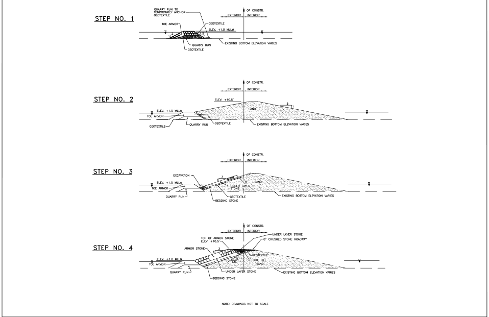 3. Then the main embankments are created by pouring sand behind the toe embankments. The rip rap toes prevent the sand from washing away with the tide, thereby allowing sedimentation to take place (sand sinks to the bottom, water is pushed to the top). These sand embankments are built much higher and wider than the toes in order for construction vehicles to be able to operate on them as the project develops.