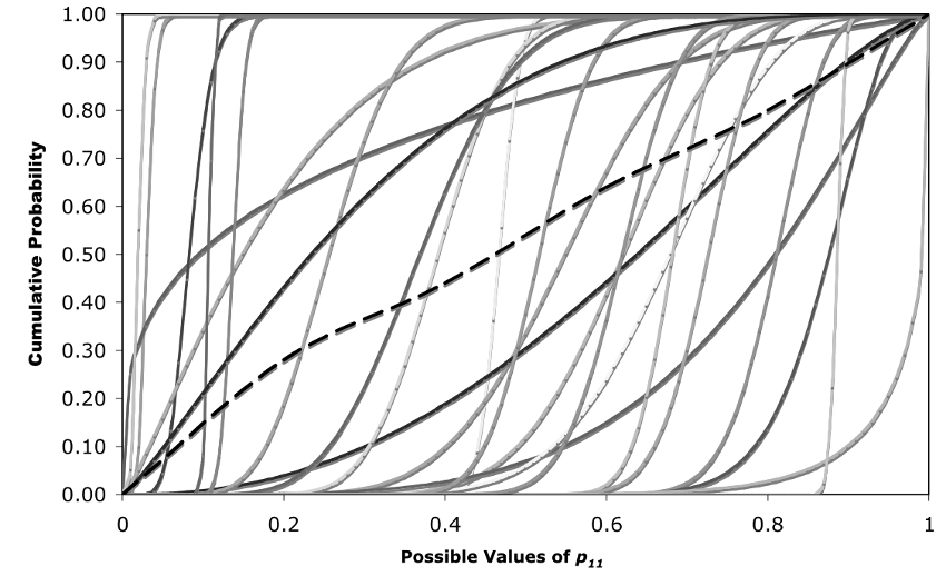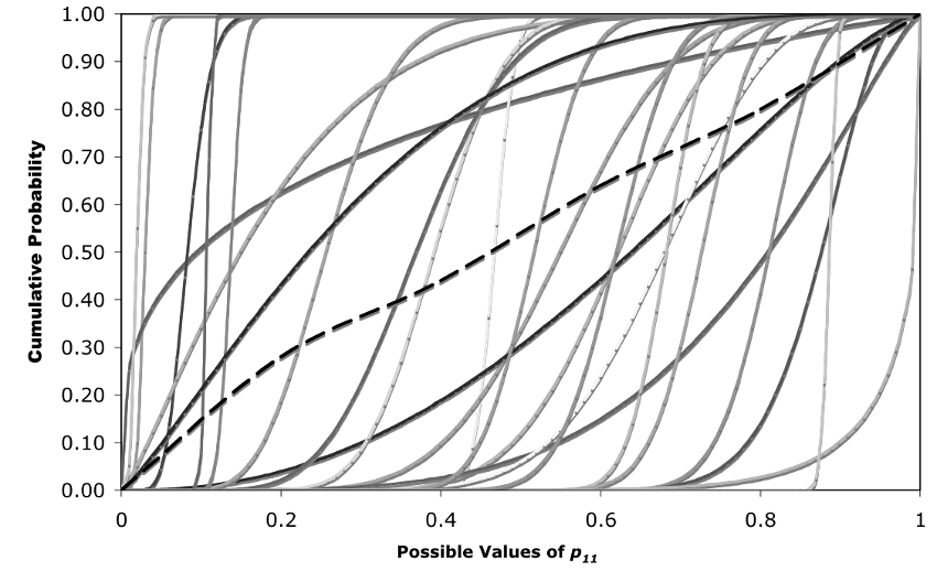The solid curves are the CDFs of the individual experts, and the dashed curve represents the CDF of the mean explosion probabilities estimated by the experts. The horizontal axis indicates the probability of explosion. The vertical axis represents the cumulative probability that the chance of explosion is less than or equal to the corresponding horizontal axis value.