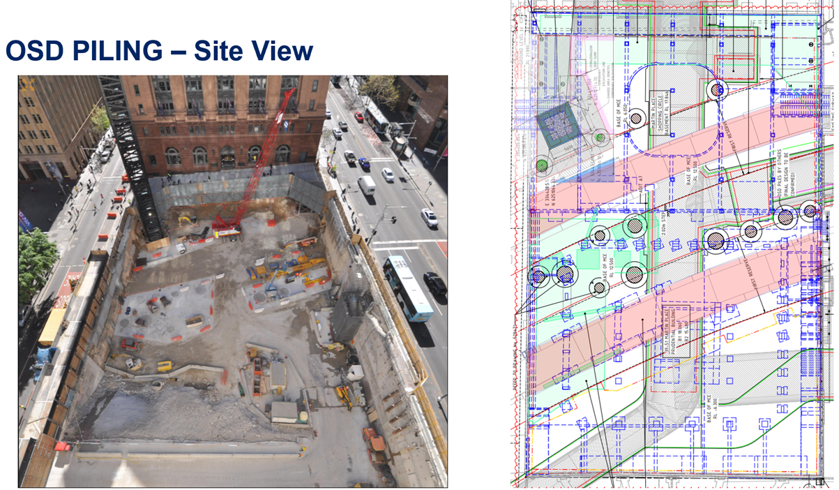 The Tunneling and Station Excavation contract at Martin Place includes the construction of 14 steel reinforced concrete piles. Each pile has a steel sleeve (max 24.1m – approx. 56t) and then a 50mm wide void to the surrounding rock for seismic loading. Three of the piles have a steel plunge column (max 29.6m long – approx. 40t) and the rest have a steel reinforcement cage installed in 3-4 spliced sections. 60MPa concrete was poured in each column using a tremie pipe.