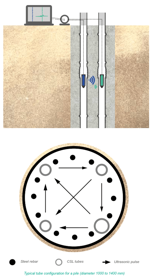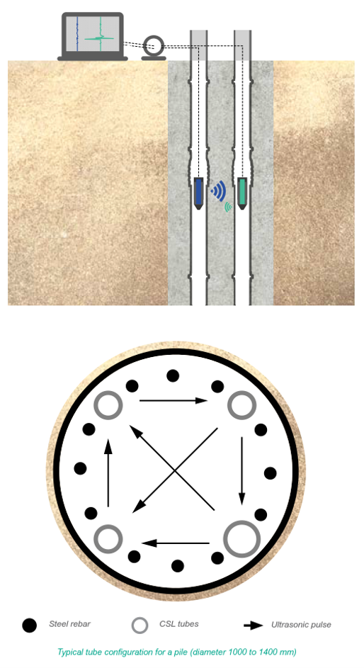What. A non destructive test method to test for the structural integrity of a pile. Sound concrete is only checked inside of the steel reinforcement cage and not the concrete cover. Also known as cross hole acoustic testing.