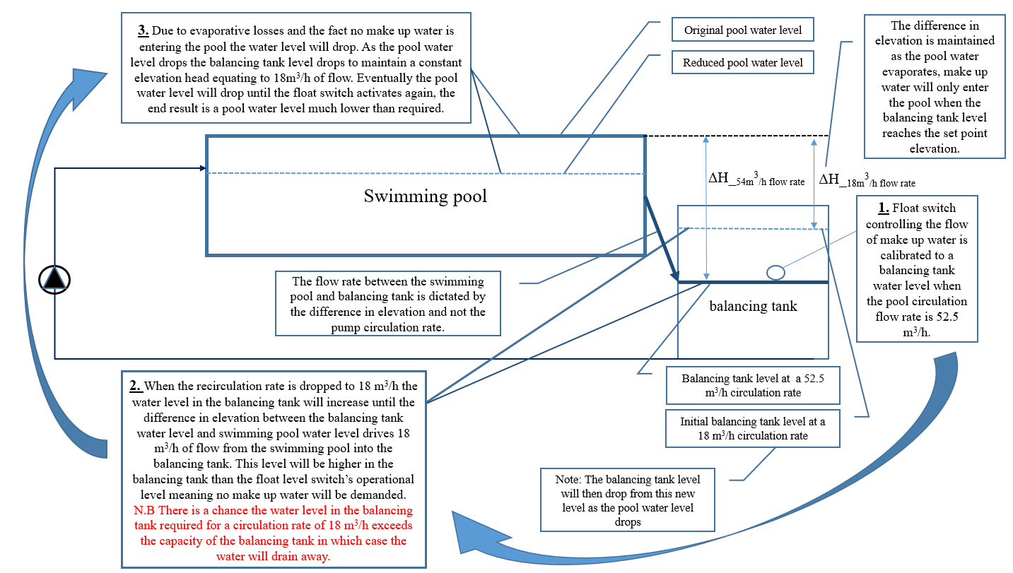 The flow diagram below explains sequentially the consequences of reducing the pool recirculation rate to realise energy savings.