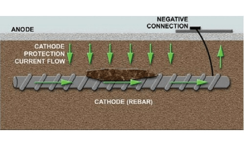 Infrastructure has a 100 year design life, beyond that of the measures listed above therefore cathodic protection is installed. Reinforcement bars are welded together to generate a loop through the structure. Generally two loops are created (redundancy) and tested for continuity prior to concrete being poured (site engineers ITP quality checks). An electrolysis point is installed at the surface of the concrete and a sacrificial anode can be attached.