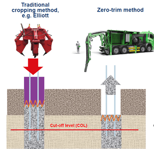 Traditionally this task of breaking out the concrete above the COL was done with a breaker or jackhammer, with operatives carefully trying to break out just the contaminated concrete and not damage the re-bar or good concrete below the COL. Other established methods use a pile cropper mounted on a 3600 excavator or high pressure water to remove the concrete above the COL.