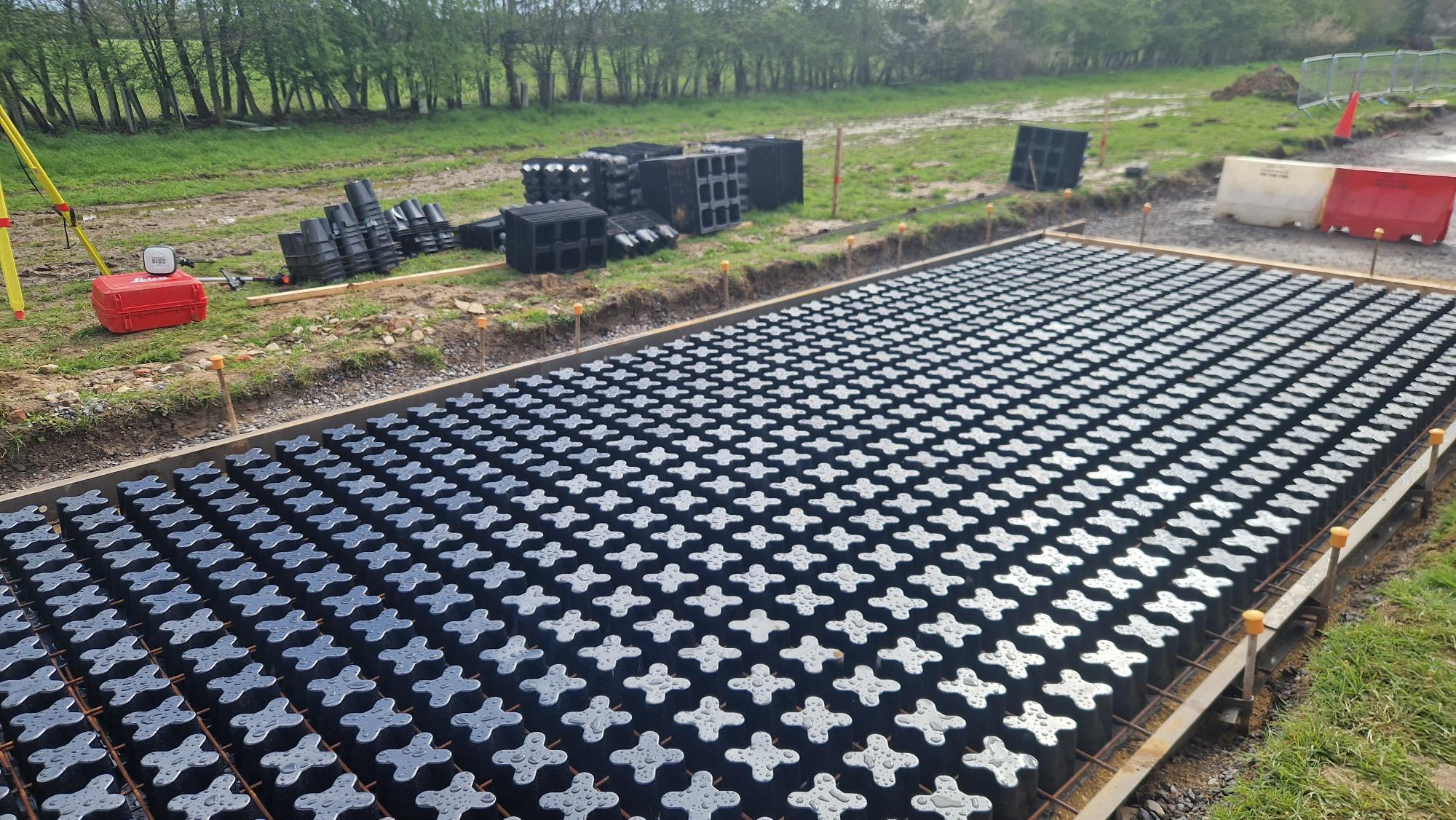 Simply put, it is a permeable pavement made up of recycled plastic formers and some steel mesh. Once installed some configurations claim to be able to carry weights of ~40T and use approximately 50% less concrete, with no need for active drainage. Relatively simple to assemble one can see why it would be attractive to a customer such as the MoD: