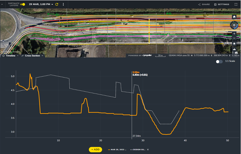 Coupled with machine tracking systems (Spotlight on DirtMate: How Does it Work? – Propeller (propelleraero.com) we can also use this data for daily progress tracking, cost tracking and material stockpile measurements. With the ability to cut 3D cross sections across the live site model, Propeller can also be used to overlay design drawings on the section, allowing for quick visualisation of material level against FSL.