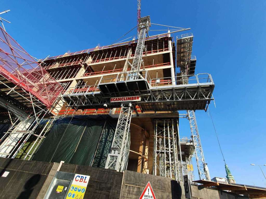 - Footprint. On site, I was surprised to see how little space the mast climbers took up when compared to a traditional scaffold support. Additionally, the storage required was arguably less than a scaffold setup for the same façade, as the mast climbing platforms and extensions are stackable. The Superintendent was clearly a big fan of this and is reluctant to go back to traditional scaffolding after this.