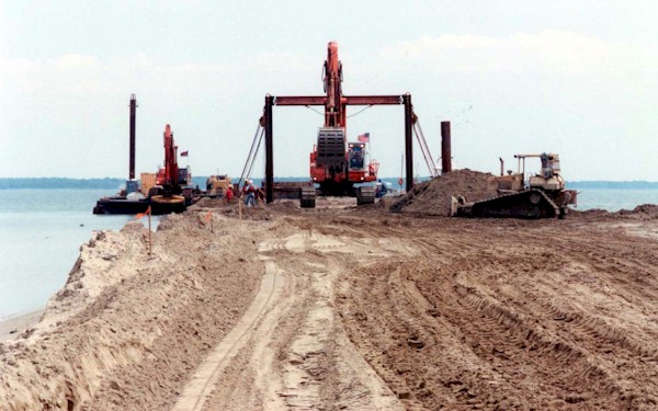 Poplar Island: My investigations for subsequent cell construction has thrown up the fact that we will need to adapt the construction sequence to include a double coffer dam as opposed to a single one as has been historically used. Traditionally, a staging area is built and then extended out to form the outline of the dike (photos not available at this time – I need to post from work). Once completed, dredge material is pumped in and excess water siphoned off using a spillway until the interior of the island is useable. At this stage a coffer is built on the external portion and the inlet structure is installed. To use a dual purpose structure as proposed, we will need to place the structure before the inner section of the cell is complete, meaning a wet gap on both sides, so I need to come up with a suitable plan to execute this without affecting the ongoing cell wall construction.