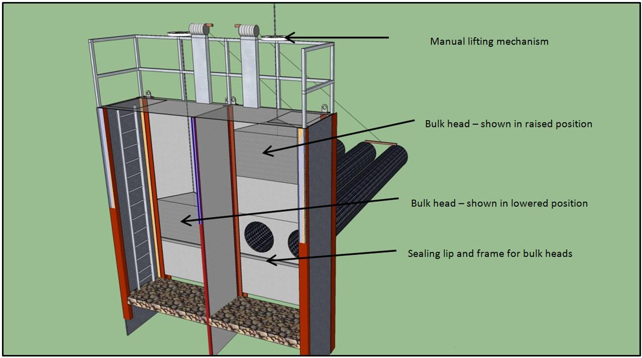 To get over the complete lack of emergency discharge options – I generated an option that would allow stop-log stack to be forcibly ripped out of their frames. Again this has been presented to ERDC who have now taken the concept another step further with the use of ‘rebar pullers’ to avoid the requirement for a crane to lift the stacks.