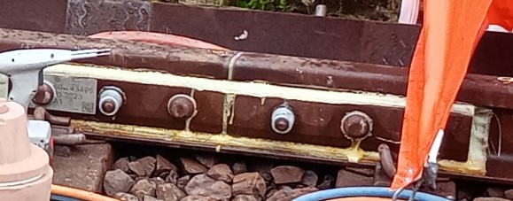 For these track circuits to work, sections of rail need to be broken up with insulated joints to allow more accurate location data to be provided. These are known as Glued Insulated Joints (GIJs), as shown in the picture below) and come prefabricated into a section of rail 3.43m or 4.57m long (or specially made if required). These are tested under factory conditions to ensure they function correctly. To fit them, a section of the existing rail has to be cut out and the new prefabricated section is welded into place. This falls to the civils team.