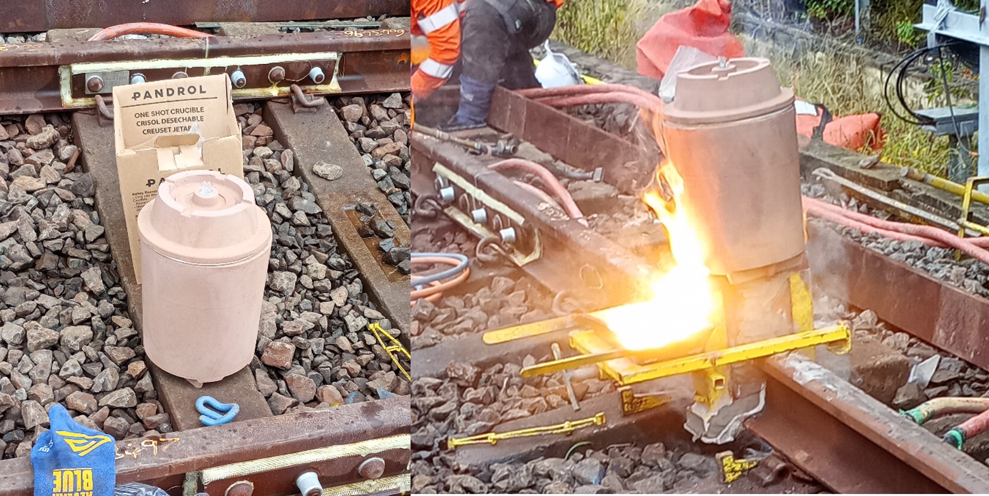 A single use crucible is then placed on top and ignited by sparking between the two prongs of an igniter fuse. The crucible’s filling consists of 37% aluminium, 13% steel, 37 % iron oxide and 13% alloying. This mixture is known as thermit and when ignited a reaction takes place that raises the temperature of the contents to 2500oC within 30 seconds. This reaction creates liquid steel which sinks to the bottom of the mold and liquid slag that rises and overflows into the slag tray.