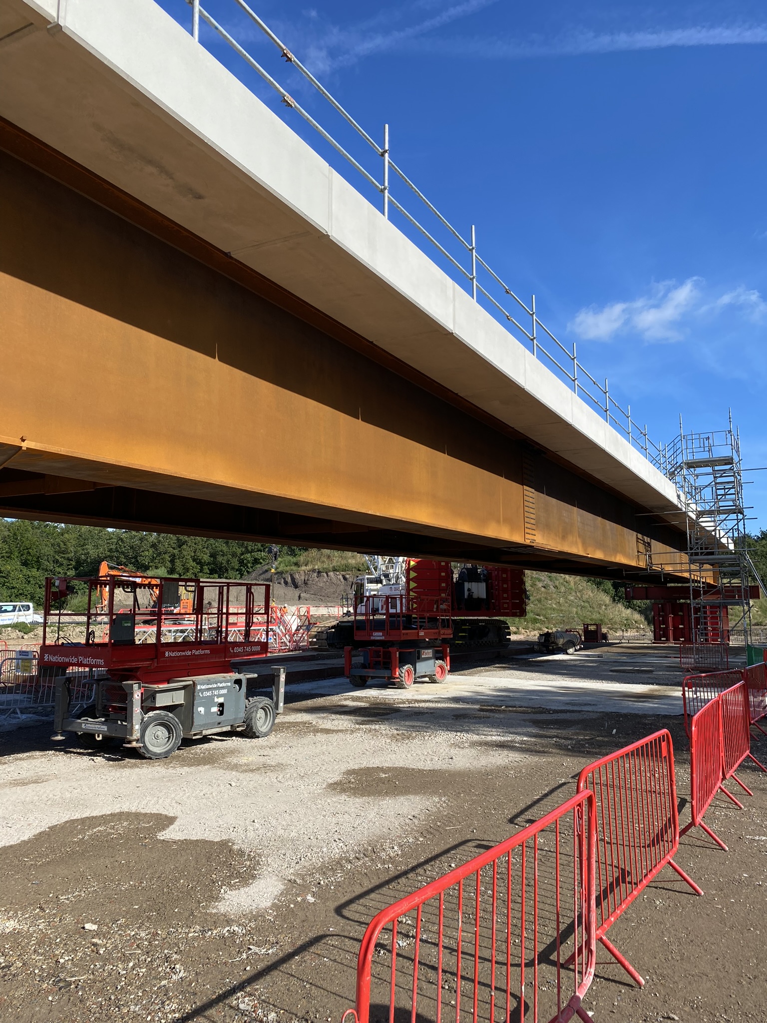 The bridge is being moved into location via a self-propelled modular transporter (SPMT) on a full road closure (currently booked for October for those in the local area!) where it will be driven out across the M25 and moved into position at Clearmount, about 100m away. Frustratingly, one of the platforms that was constructed for this has been dug up by the drainage sub-contractor, with new drainage laid right underneath where the bridge will be travelling. This is going to pose some challenges in the future, but hopefully nothing that will slow the project down even further! We discussed the challenges associated with sub-contractors and their own programmes and how sometimes construction appears to take place out of sequence and causes more problems than it solves!