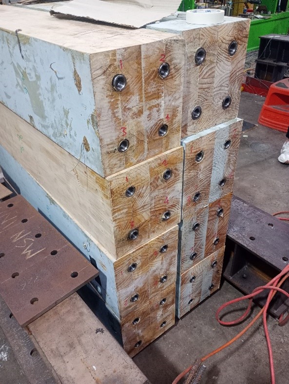 Connections could be de-constructable, created using steel plates (as shown above). These are bolted onto the end of the threaded rebar (the same bars as used in concrete) that protruded from the timber members, allowing the joints and structure to be dismantled at the end of its life. Alternatively, for more permanent structures ultra-high strength concrete, that cured within 48hrs to over 100MPa, was used to connect members, allowing the structure to be load bearing and built in a short period of time, as well as protecting joints from fire.