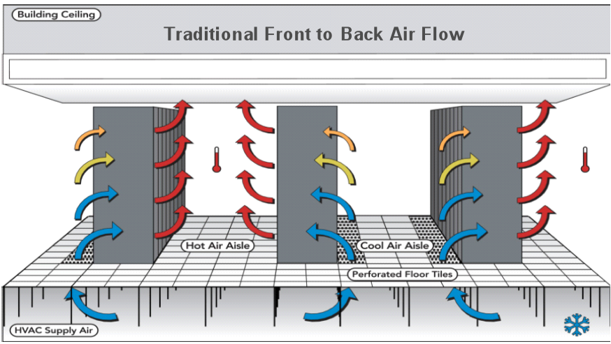 Server rooms are ideally internal within a building in order to avoid solar heat gains and also because servers don’t need a window to stare forlornly out of. They are usually sealed from infiltration; tidy, to control airflow and have some form of HVAC. The current standard for low and medium density data centres and server rooms is to use a hot aisle, cold aisle system as illustrated below. Cold air is fed from low down in the ‘cold aisle’, either through the floor or by retrofitted ducts; the server blade draws it in through the front and rejects warm air through the rear into the ‘hot aisle’. This rises and is collected by the return air system. As the photos above indicate this was not the case.