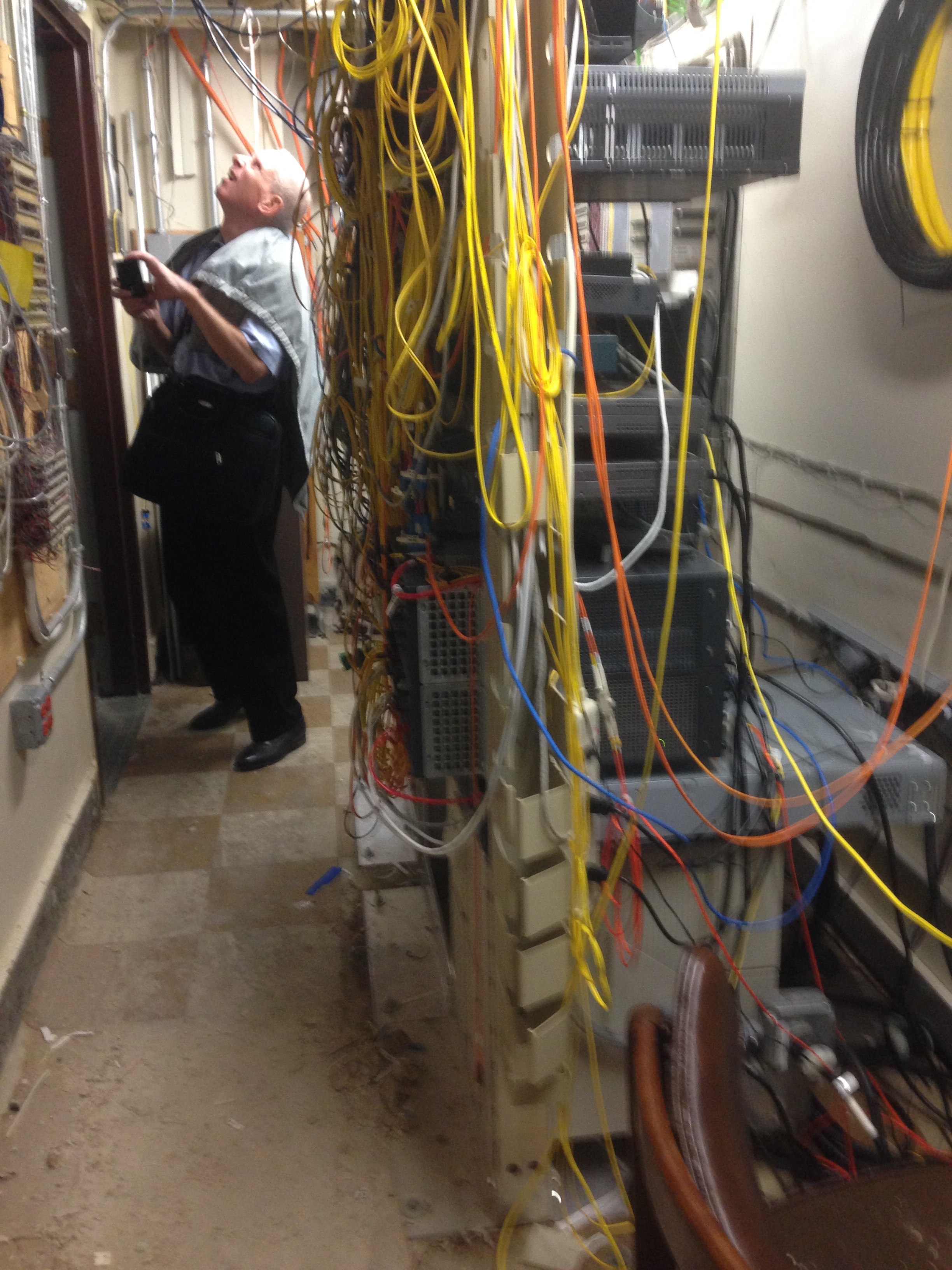 Don inspecting the many unsealed penetrations in a small converted basement broom closet. This room had about 12U of switches and had a retrofitted ductless cooling system. It also had a condensate drain to a sump, thus allowing the condensate to re-evaporate and continually cycle through the cooling system.