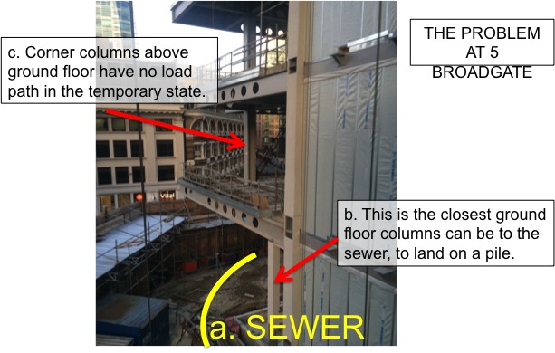 The (big) truss on the roof cantilevers out to allow the perimeter column to hang in tension and suspend the corner. Jacking was used to ensure it had ‘picked up’ the perimeter.