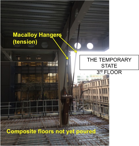 In order to overcome this issue the corner would be hung from a truss on the roof as well as Macalloy hangers on the 1st and 2nd floors.