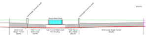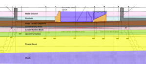 Geology at the central section of Tunnel (clear purple represents the Docks and surrounding brickwork, and grey shafts the ventilation shafts, marking the extent of the Twin Tunnel).